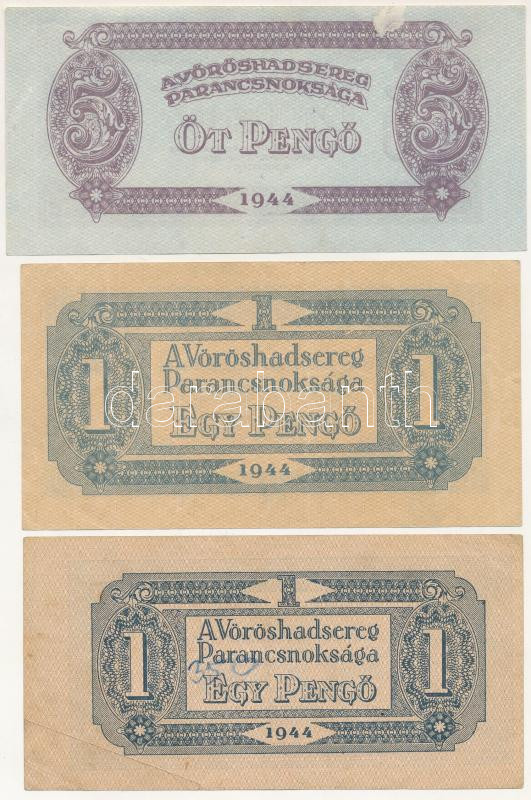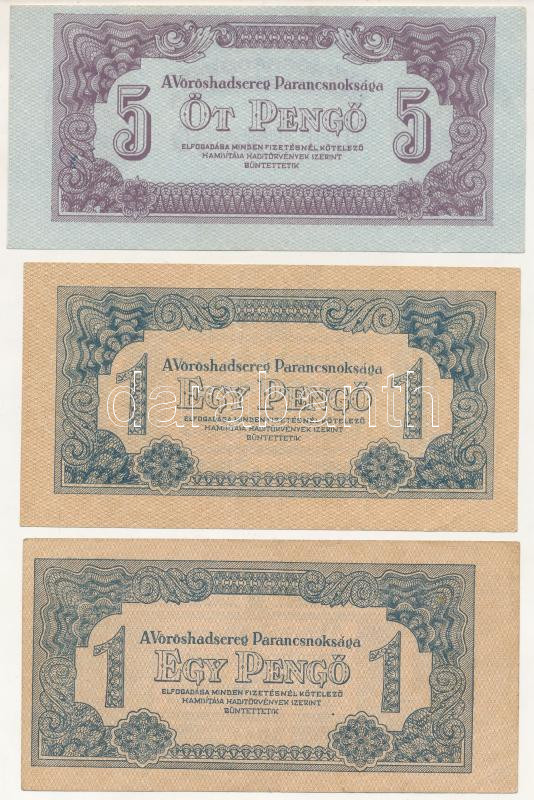 1944. 1P "A Vöröshadsereg Parancsnoksága" (2xklf) hátoldali kép kisebb, függőleges alapnyomattal + támpéldány + 5P "A Vöröshadsereg Parancsnoksága" T:F szép papír