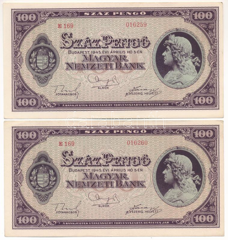 1945. 100P (2x) sorszámkövetők "E 169 016259 - E 169 016260" T:AU,XF h... https://www.darabanth.com/de/468-Fernauktion/468.0/Numismatik/Ungarische-Banknoten~500008/1945-100P-2x-sorszamkovetok-E-169-016259-E-169-016260-T-AU-XF-hajtatlanok-de~II3165812