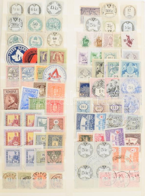 Beschreibung: Egy berakólapnyi illetékbélyeg klf kiadásokból benne nagy címleket és városi illetékbélyegek