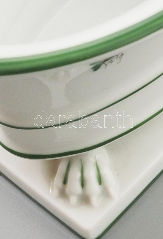Beschreibung: Herendi petrezselyemlevél mintás váza, bécsirózsás díszítéssel. Talpazaton körmös lábakon álló ovális vázatest, jelzett, hibátlan, 15x10 cm