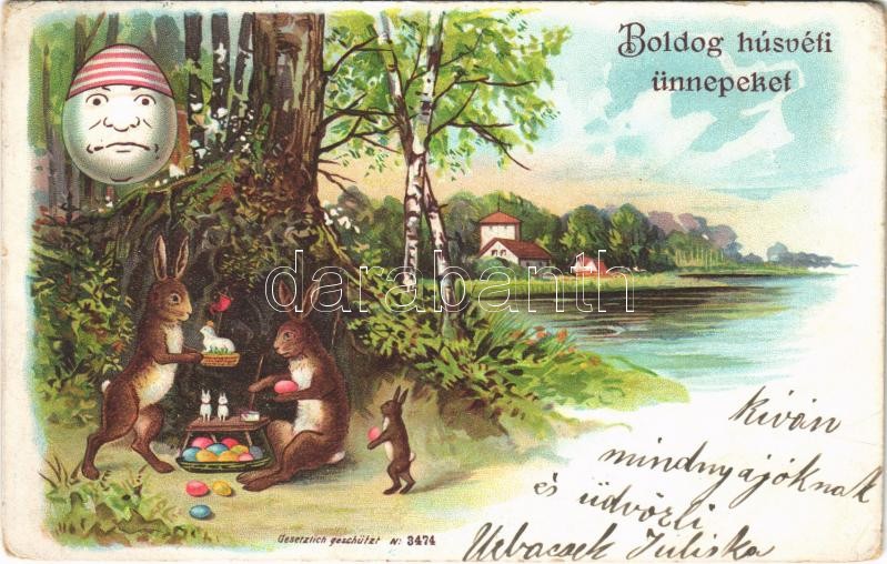 Beschreibung: 1901 Boldog húsvéti ünnepeket / Easter greeting art postcard, rabbit family with egg. litho (kopott sarkak / worn corners)