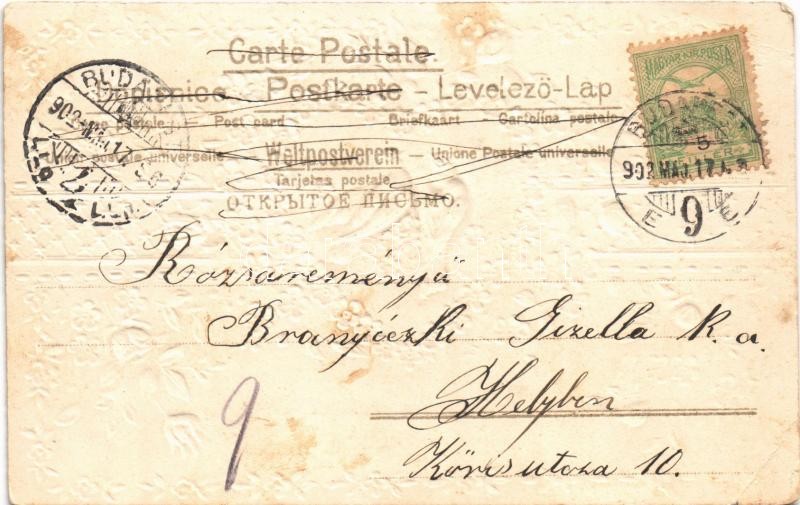 Beschreibung: 1902 Kellemes pünkösdi ünnepeket / Pentecost greeting card. Art Nouveau, floral, Emb. litho (EK)