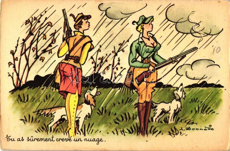 Beschreibung: 'Tu as surement crevé un nuage.' / you've probably popped a cloud, huntresses with hunting dogs in rainfall, humour, s: L. Bonnotte (EK)