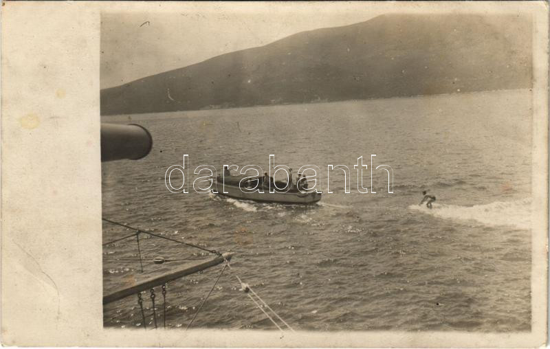 K.u.K. Kriegsmarine / Osztrák-magyar matróz vízisízés közben egy motorcsónak által húzva / Austro-Hungarian Navy officers go water-skiing on a motor launch. photo (fl)