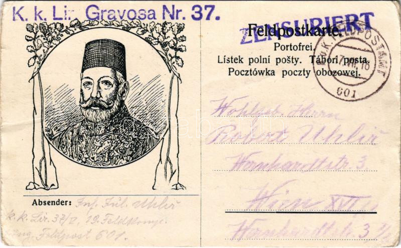 Beschreibung: 1916 V. Mehmed oszmán szultán / Mehmed V. Feldpostkarte + "K.k. Lir. Gravosa Nr. 37." (EK)