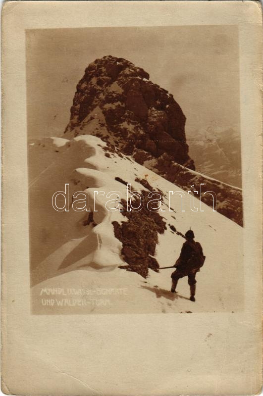 Beschreibung: Tuxer Alpen, Tux Alps (?) ; hiker, mountain peak, photo (gyűrődések, creases)
