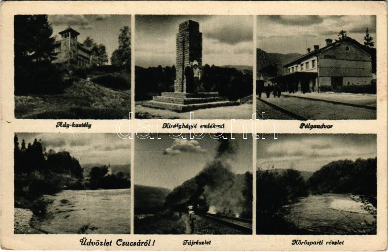 Csucsa, Ciucea; Ady kastély, Királyhágói emlékmű, Pályaudvar, vasútállomás, Táj részlet, gőzmozdony, vonat, Körös-parti részlet / castle, monument, railway station, locomotive, train, Cris riverside (fa)