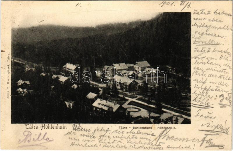 Beschreibung: 1901 Barlangliget, Höhlenhain, Tatranská Kotlina (Magas-Tátra, Vysoké Tatry); látkép. Sima T. kiadása / general view (kis szakadás / small tear)