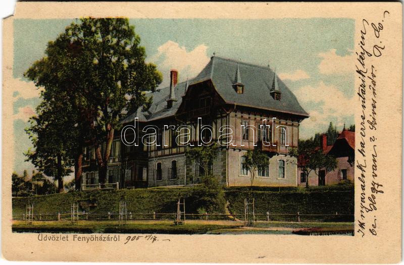 Beschreibung: 1905 Fenyőháza, Lubochna; Gyógyfürdő, vízgyógyintézet és nyaralótelep (bérlő Jáhn Nándor) / spa, villa, hotel (EM)