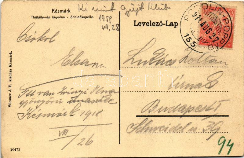 1918 Késmárk, Kezmarok; Thököly vár kápolna. Wiesner J. F. kiadása / S... https://www.darabanth.com/de/469-Fernauktion/469.0/Ansichtskarten/Slowakei~1500006/1918-Kesmark-Kezmarok-Thokoly-var-kapolna-Wiesner-J-F-kiadasa-SchloC39Fkapelle-castle-~II3169384