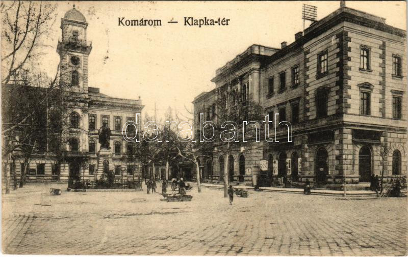 1923 Komárom, Komárno; Klapka tér és szobor, városháza, gyógyszertár, piac. Vasúti levelezőlapárusítás 4965. / square, town hall, pharmacy, market, monument