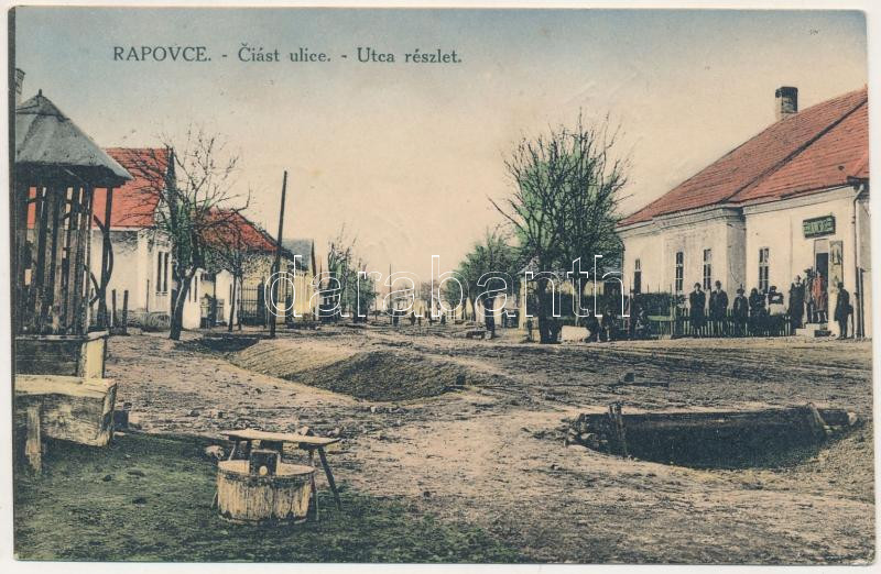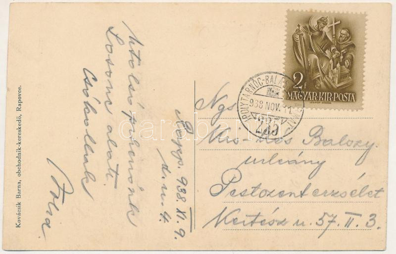 1938 Rapp, Rapovce; Ciást ulice / utca, Kovácsik Barna üzlete és saját kiadása / street, shop + "IPOLYTARNÓC - BALASSAGYARMAT 235" vasúti mozgóposta bélyegző (EK)