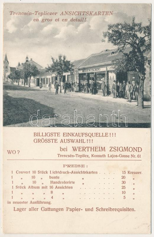 Trencsénteplic, Trencianske Teplice; Trencsén-Tepliczer Ansichtskarten en gros et en detail / Wertheim Zsigmond papírkereskedése, könyvnyomdája és képeslap üzlete reklámja / postcard shop and publishing house's advertisement card (EK)