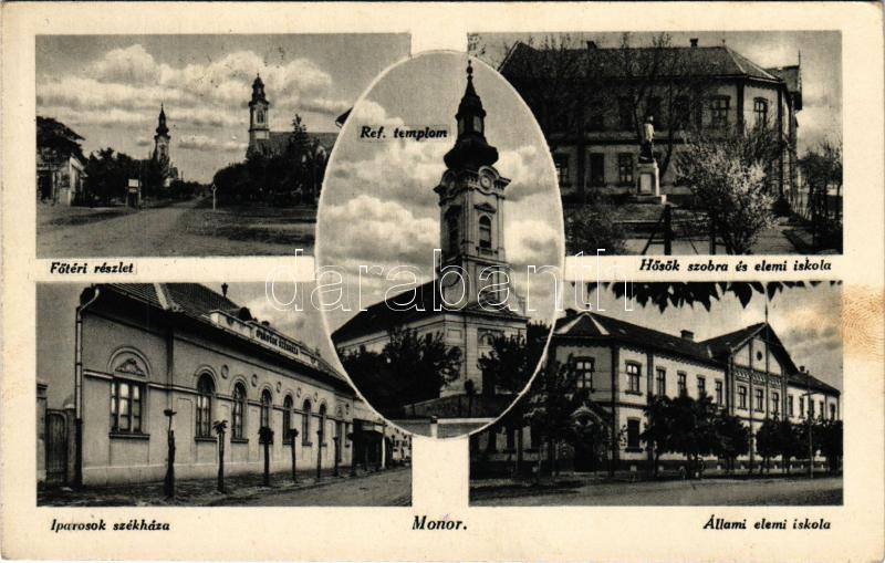 1939 Monor, Állami elmei iskola, Református templom, Iparosok székháza... https://www.darabanth.com/de/469-Fernauktion/469.0/Ansichtskarten/Ungarn~1500004/1939-Monor-Allami-elmei-iskola-Reformatus-templom-Iparosok-szekhaza-Hosok-szobra-Fo-ter~II3136954