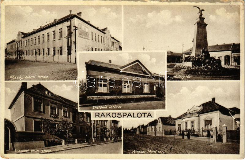 Beschreibung: 1941 Budapest XV. Rákospalota, Községi elemi iskola, Erzsébet utcai iskola, Hubay tér, hősök szobra, Stefánia intézet, Wagner Manó tér (EK)