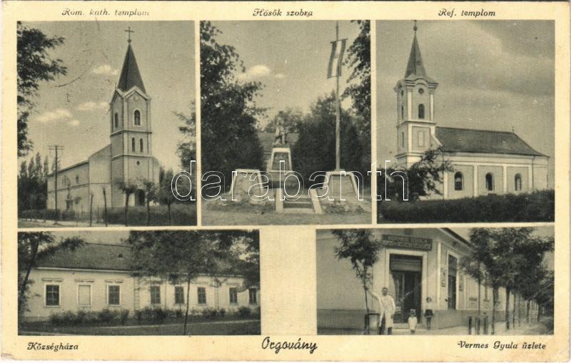 Beschreibung: 1942 Orgovány, Római katolikus templom, Hősök szobra, emlékmű, Országzászló, Református templom, Községháza, Vermes Gyula üzlete (EB)