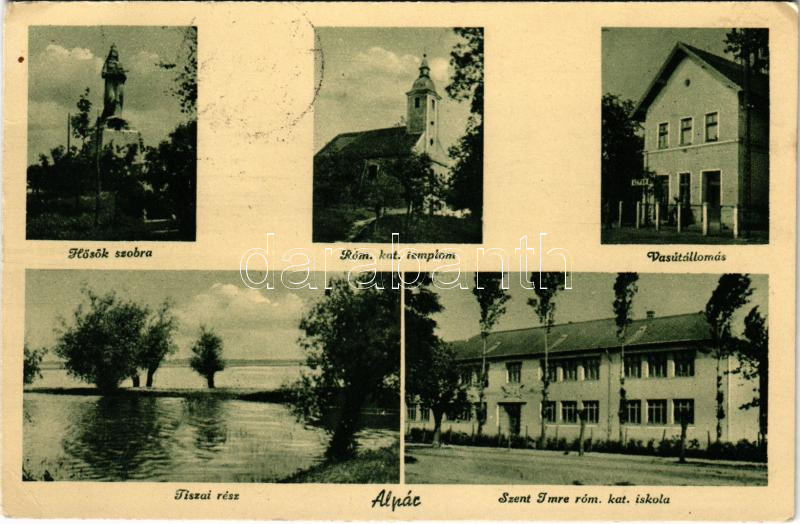 Tiszaalpár, Alpár; Hősök szobra, Római katolikus templom, vasútállomás, Tiszai rész, Szent Imre római katolikus iskola. Ifj. Füleki István kiadása (EK)