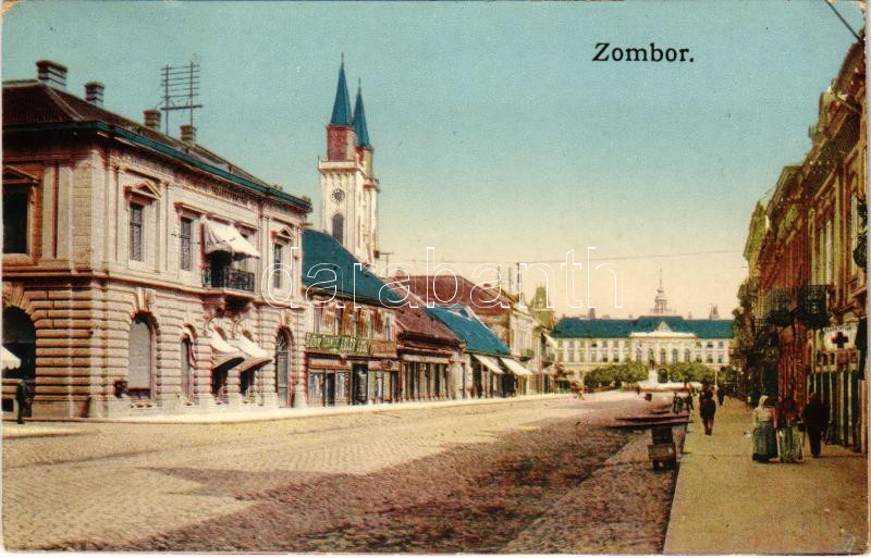 Beschreibung: 1913 Zombor, Sombor; utca, Adler üzlete, gyógyszertár / street view, shops, pharmacy (Rb)