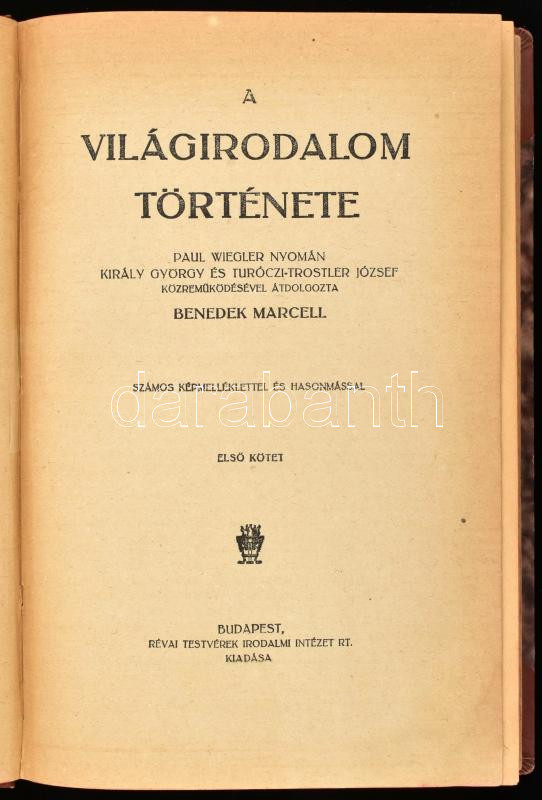 A világirodalom története. Paul Wiegler nyomán Király György és Turóczi-Trostler József közreműködésével átdolgozta: Benedek Marcell. I. köt. Bp., én., Révai. Átkötött félvászon-kötés.