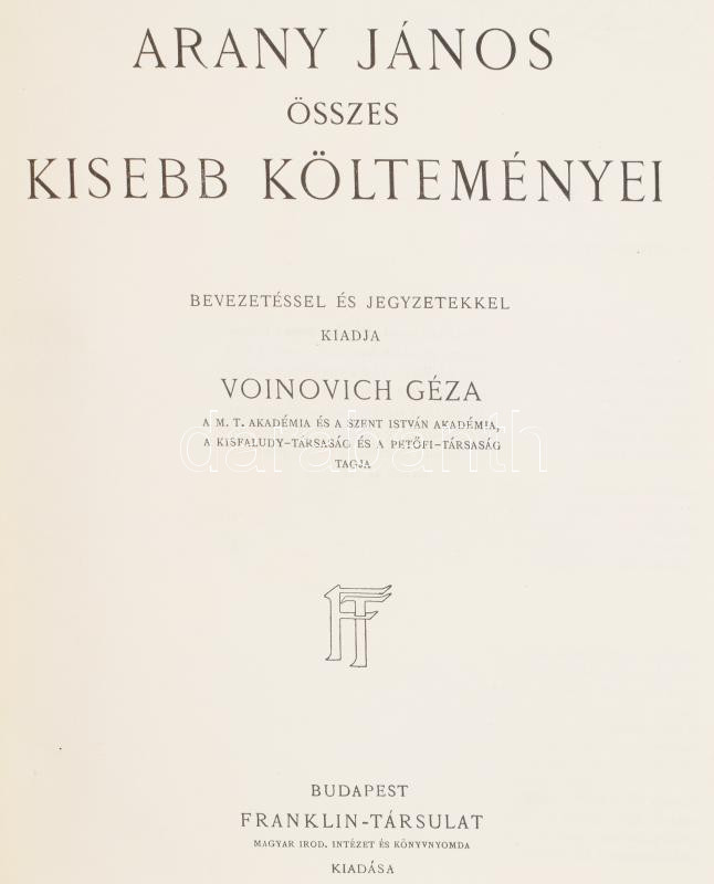 Arany János összes kisebb költeményei. Bevezetéssel és jegyzetekkel kiadja Voinovich Géza. Bp.,[1925.],Franklin, 1 (címkép, Arany János portréja) t. +308 p. Bibliofil kiadás! Kiadói aranyozott félbőr-kötés, kissé kopott kiadói kartontokban, kissé kopott borítóval, a gerincen kis sérüléssel. Számozott (36./100) példány!