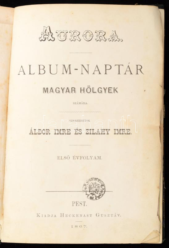 Aurora. Album-naptár magyar hölgyek számára. Szerkesztik Áldor Imre és Zilahy Imre. Első évfolyam. Pest, 1867, Heckenast Gusztáv, 1 (acélmetszetű címkép, Jókainé (Laborfalvi) Róza portréja, Barabás Miklós rajza után Josef Axmann metszése, 17x12 cm) t. + VIII + 200 p. Átkötött félvászon-kötés, a gerincen címkével, a címlapon adóbélyeggel, foxing foltos lapokkal, a címkép és a címlap kijár, a naptári rész és a jegyzetlapok hiányoznak! Ritka!