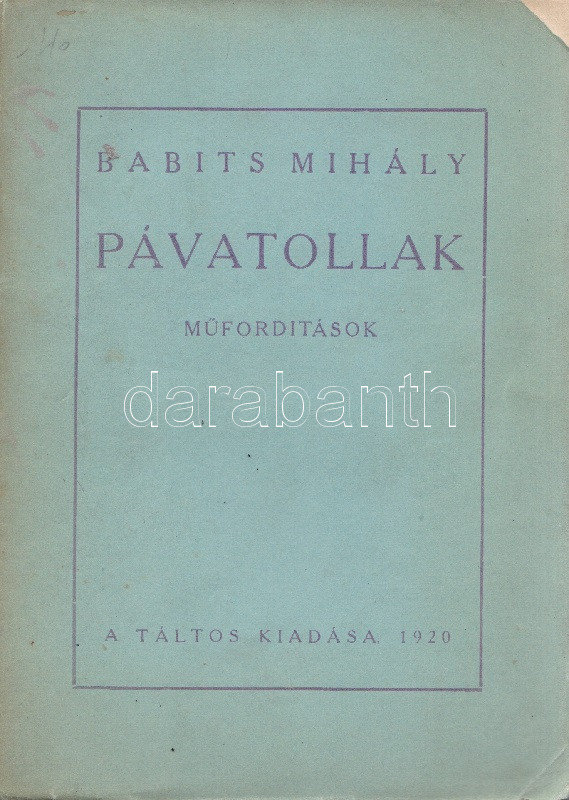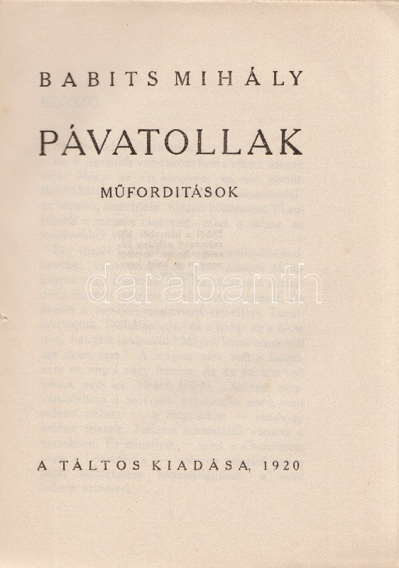 (Budapest), 1920. A Táltos ... https://www.darabanth.com/de/469-Fernauktion/469.0/Bucher/Bucher-Andere-kuriositaten~2000025/Babits-Mihaly-Pavatollak-Muforditasok-Budapest-1920-A-Taltos-kiadasa-Helios-sajtoi~II3112734