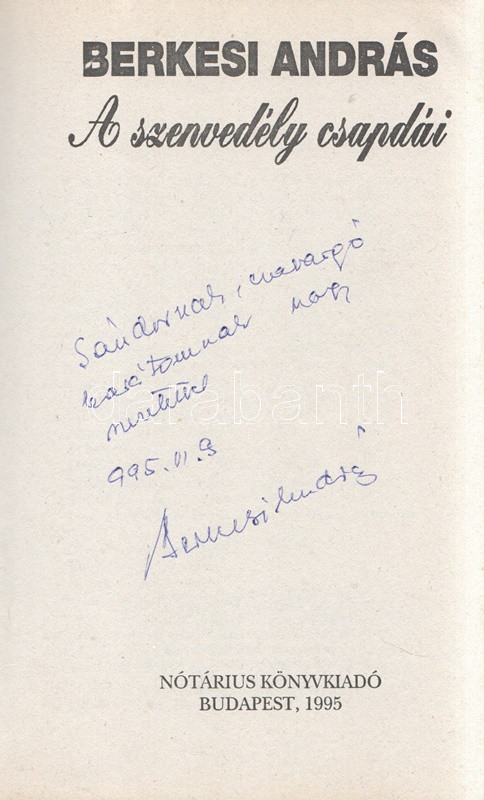 Berkesi András: A szenvedély csapdái. Budapest, 1995. Nótárius Könyvkiadó (Alföldi Nyomda Rt., Debrecen). [3]-309 + [1] p. Egyetlen kiadás. Dedikált: ,,Sándornak, csavargó barátomnak nagy szeretettel: Berkesi András. 995. VI. 9." Fűzve, enyhén megtört gerincű, színes, illusztrált kiadói borítóban. Jó példány.