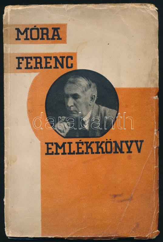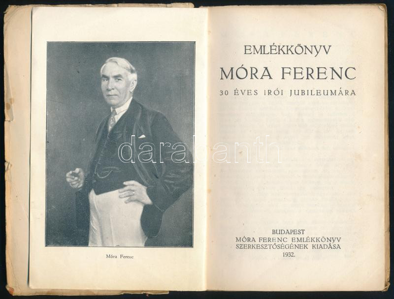 Emlékkönyv Móra Ferenc 30 éves írói jubileumára. Bp., 1932, Móra Ferenc Emlékkönyv Szerkesztősége, 64 p.+ 6 t. Fekete-fehér fotókkal illusztrált. Kiadói papírkötés, kopott, foltos, szakadozott borítóval, sérült, hiányos gerinccel.