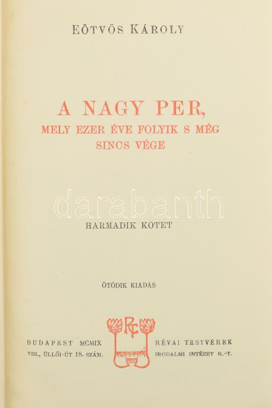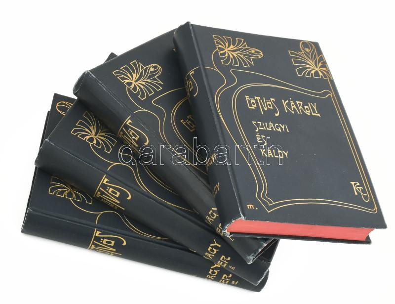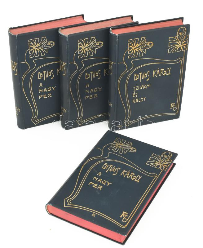 Eötvös Károly 2 műve (4 kötetben): A nagy per. I-III köt. + Szilágyi és Káldy. Eötvös Károly Munkái X-XII. és XVII. Bp., 1906-1909, Révai. Kiadói aranyozott, szecessziós egészvászon-kötés, festett lapélekkel, jó állapotban.