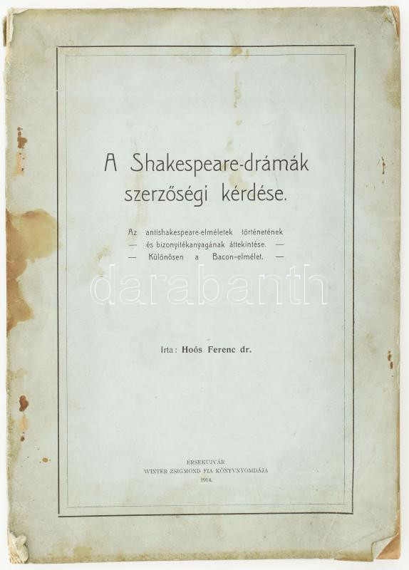 Hoós Ferenc: A Shakespeare-drámák szerzőségi kérdése. Érsekújvár, 1914, Winter Zsigmond Fia, 73 p. Kiadói papírkötés, foltos borítóval, kissé sérült gerinccel, néhány lap sarkán szamárfülekkel.