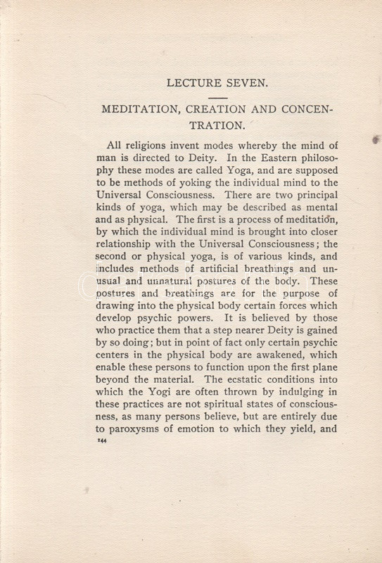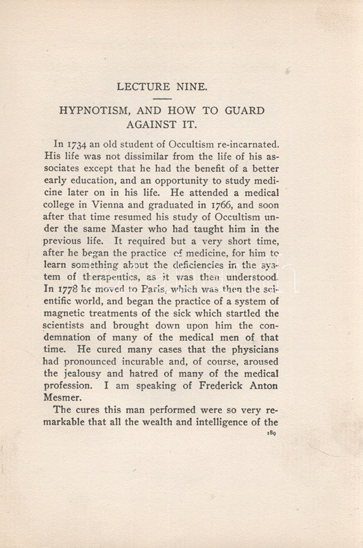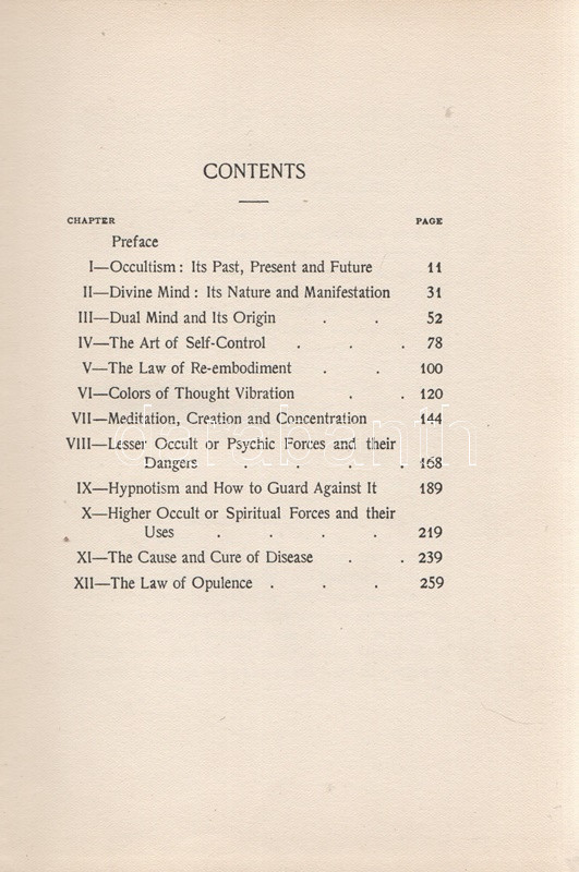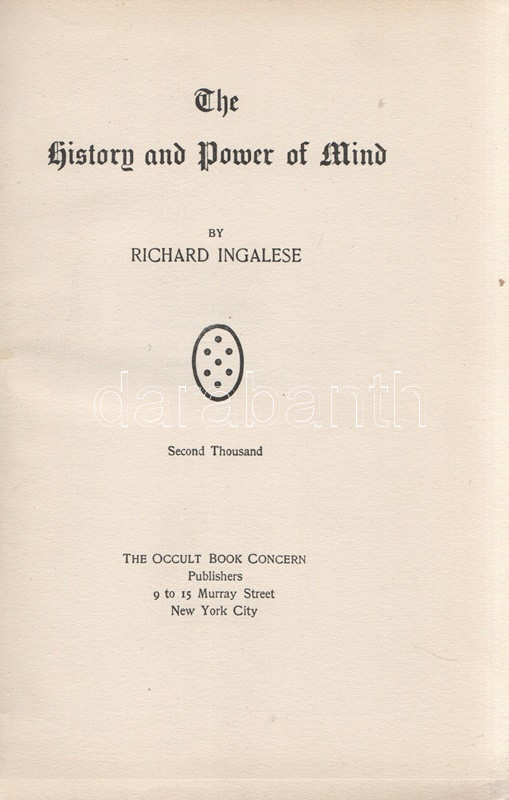 Ingalese, Richard: The History and Power of Mind. New York City, (1903). The Occult Book Concern Publishers (Watkins Press). 1 t. (hártyapapírral védett címképen a szerző portréja) + 284 + XXIV + [2] p. Richard Ingalese (1863-1934) amerikai okkult szerző. Kötetében 1900-1902 közötti előadásaiból válogat. A szerző az előszóban kijelenti, hogy kötetét nem szánta a tételes vallások híveinek, úgyszintén nem szánta az elkötelezett materialisták számára, ám az érdeklődő nagyközönség számára érdekes beszámolót nyújthat, akár a pszichés, pszichikus jelenségek, akár a mélyebb okkult elméletek iránt érdeklődik a reménybeli olvasó. Jellemző fejezetcímek: Az okkultizmus múltja, jelene és jövője. Az önkontroll művészete. Az újra megtestesülés törvénye. A gondolathullámok színei. Meditáció és koncentráció. Hipnózis és hogyan védekezzünk ellene. Nagyobb okkult és spirituális erők és a velük való bánásmód. A betegségek oka és gyógyítása. A munka először 1902-ben jelent meg, példányunk a második lenyomatból származik. Az első előzéken régi tulajdonosi bejegyzés, néhány oldalon széljegyzetek, aláhúzások. Példányunk első előzékének fűzése meglazult. Poss.: Gyöngyöshalászy Takách Zoltán [Gyöngyöshalászy Takách Zoltán magyar származású zongoraművész, zongoratanár és zeneszerző. A budapesti Zeneakadémián tanult művész az 1900-as évek első évtizedében magas rangú magyar diplomaták ajánlásával került az amerikai komolyzenei élet sodrába - az amerikai keleti part nagyvárosaiban, New Yorkban, Philadelphiában és az amerikai elit üdülőhelyein lépett fel, egyúttal magán zeneiskolát is fenntartott az Egyesült Államokban.] Aranyozott, enyhén sérült, enyhén kopott kiadói egészvászon kötésben. Körülvágatlan példány.