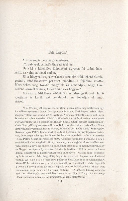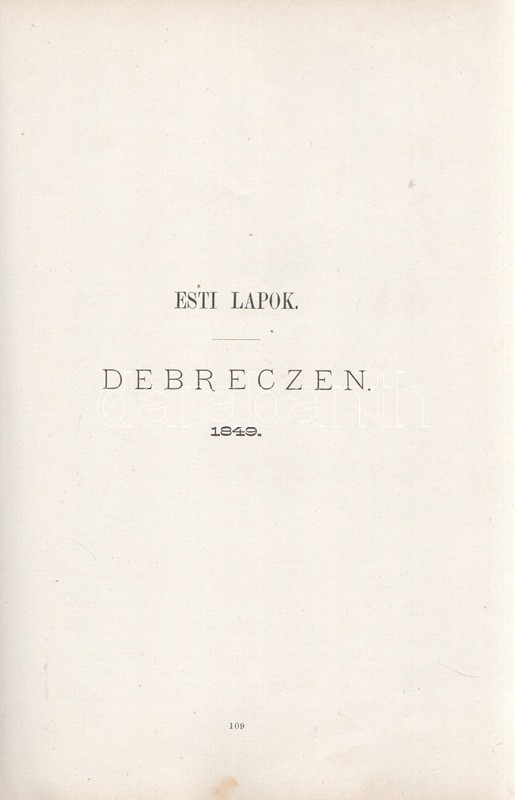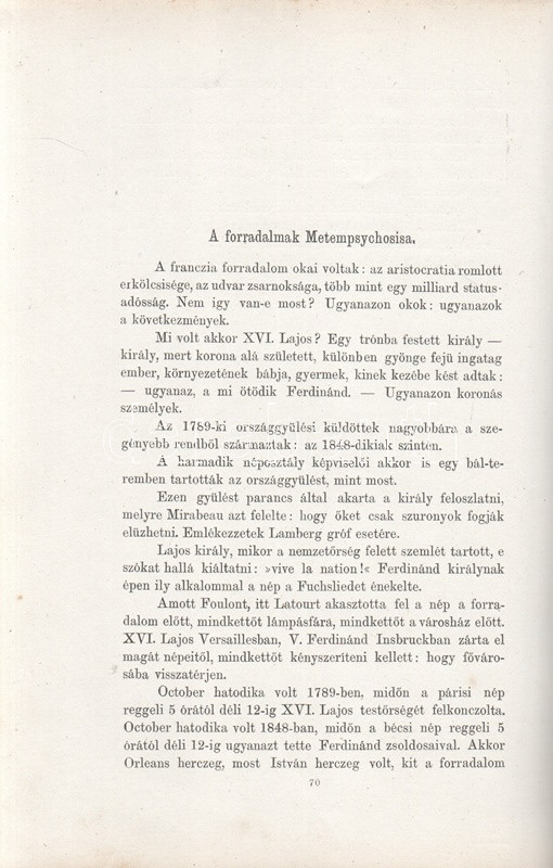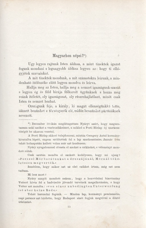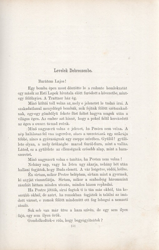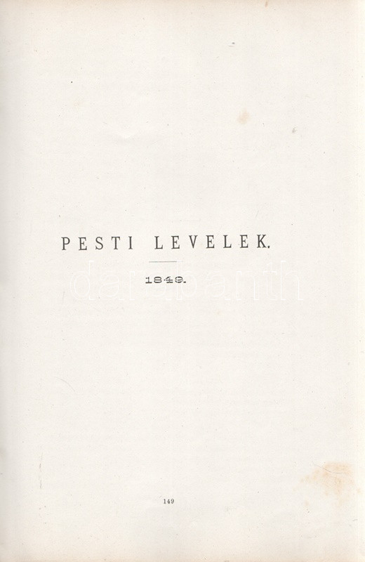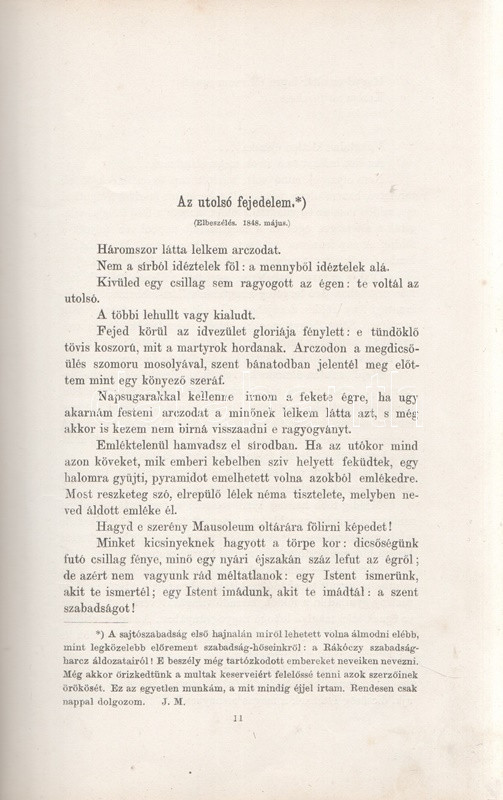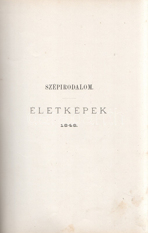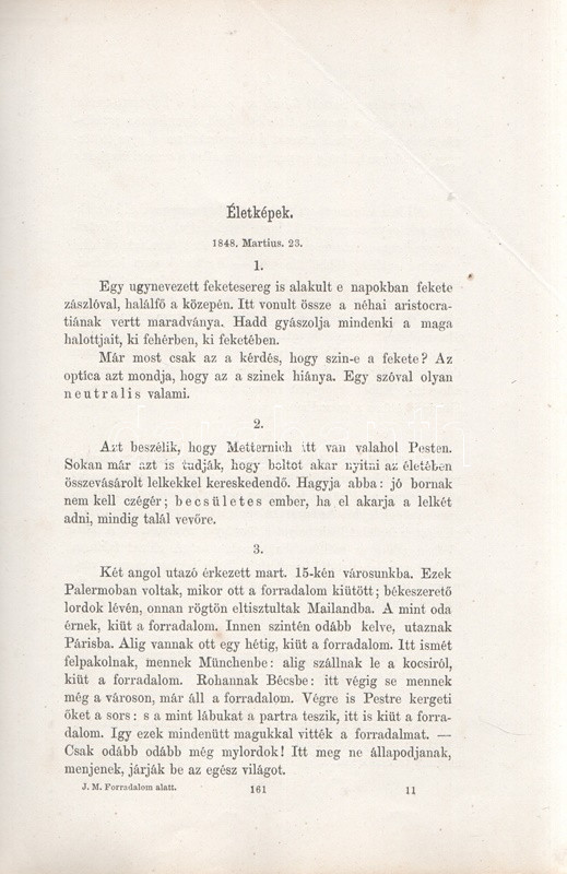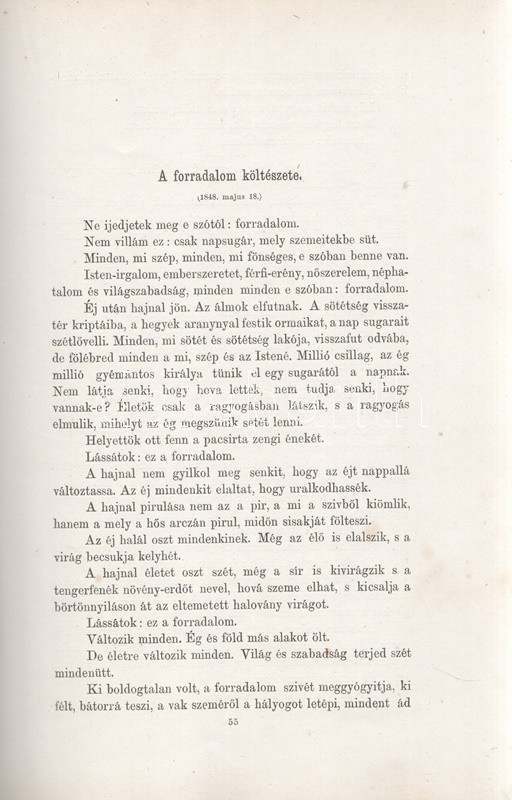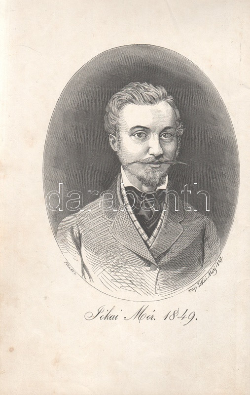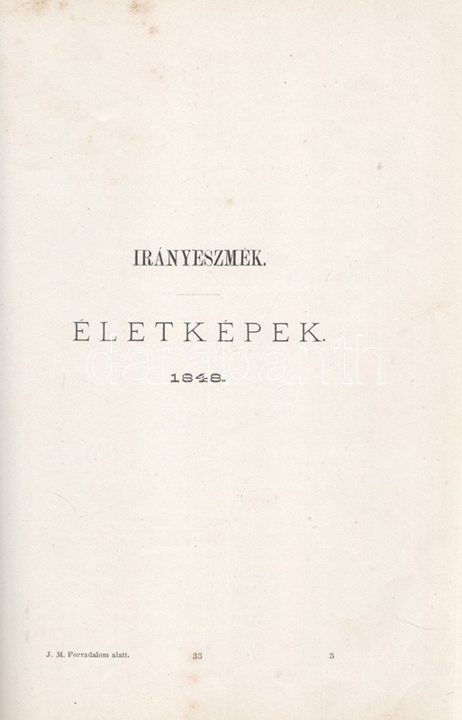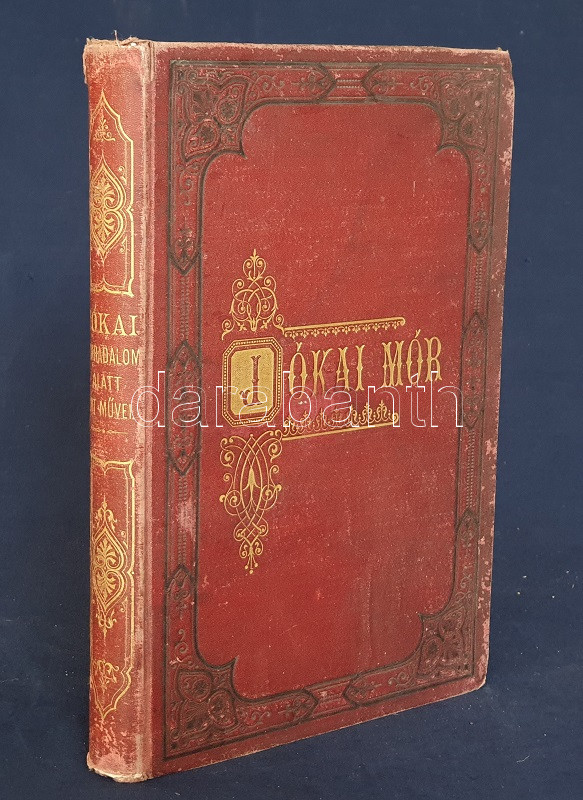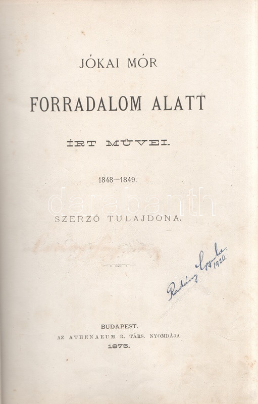 Jókai Mór: Jókai Mór Forradalom alatt írt művei. 1848-1849. Budapest, 1875. Szerző - Athenaeum Rt. ny. 1 t. (címkép) + 274 p. Első kiadás. Jókai Mór 1848-1849-ben publikált szépirodalmi és publicisztikai művei, a Jókai-írásokat közlő folyóiratok szerinti rendben (Életképek, Közlöny, Charivari). Az utolsó fejezetben közölt írások már a szabadságharc bukása után, 1849-ben, de még a cenzúra megkeményedése előtt láttak napvilágot. A címlapon törölt és olvasható régi tulajdonosi bejegyzés. Egyes oldalakon enyhe foxing. Szüry 2093. Aranyozott, festett, vaknyomásos kiadói egészvászon kötésben, pávamintás festésű lapszélekkel. Jó példány.