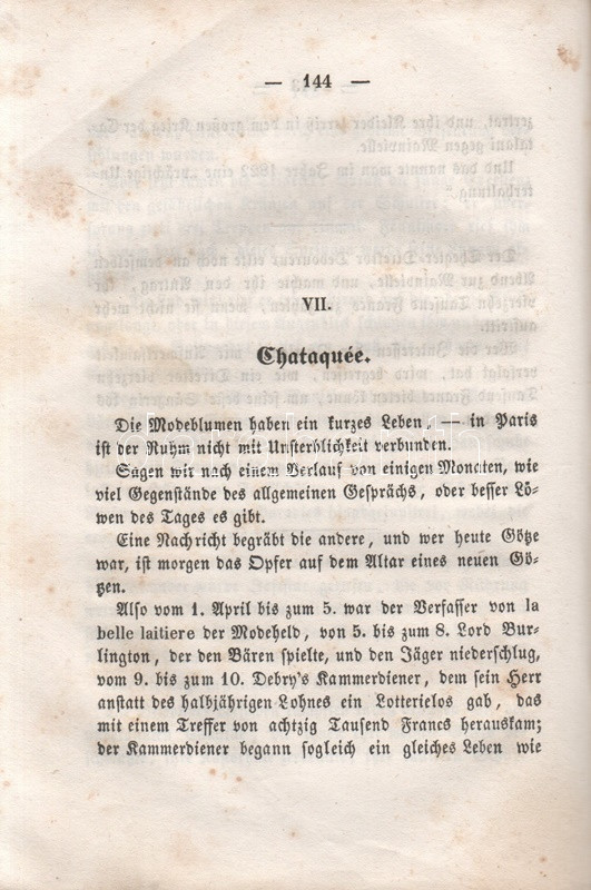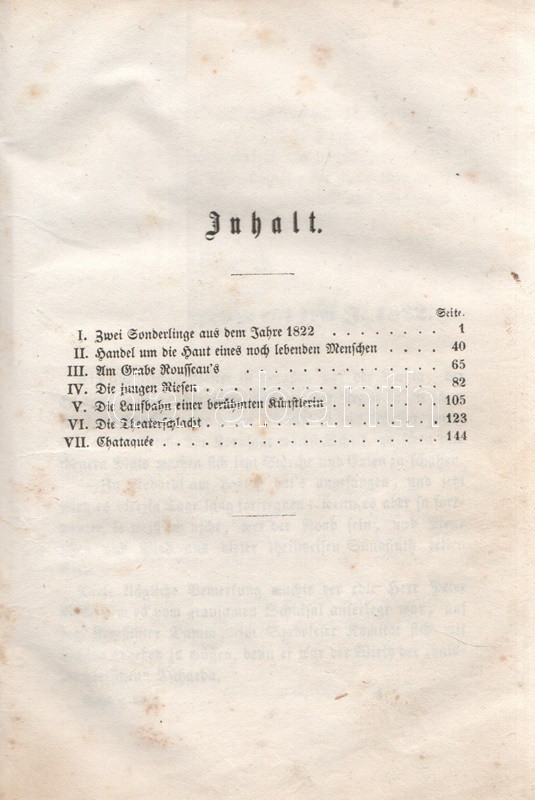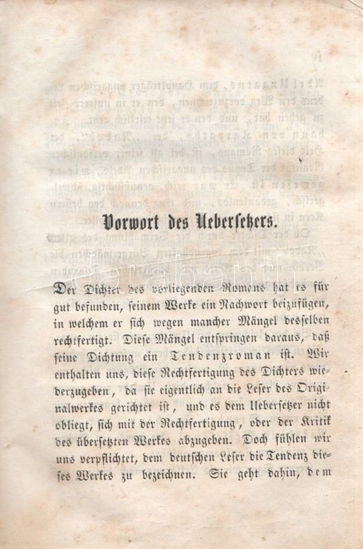 Jókai, [Mór] Moritz: Ein ungarischer Nabob. Deutsch von Adolf Dux. Erster Band. [Első kötet.] Pest, 1856. Verlag von Gustav Emich (Buchdruckerei von Emich Gustav). V + [3] + 191 + [1] p. Első német kiadás. Jókai Mór klasszikus regénye először 1853-ban jelent meg, első német fordítását Dux Adolf, pozsonyi műfordító készítette el, néhány évvel a regényeredeti után, négy kötetben. Az utolsó ív levelein középen apró javítás, az első kötéstáblán és az első előzéken katalóguscímke, illetve tulajdonosi bejegyzés, a címlap verzóján gyűjteményi bélyegzés. Könyvtári duplum. Aranyozott gerincű korabeli félbőr kötésben, mintás festésű lapszélekkel. Jó példány, ritka.