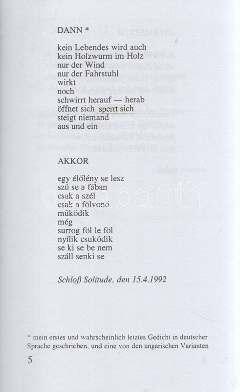 Kányádi Sándor: Kikapcsolódás - Entspannung. [Versek - Gedichte.] (Dedikált.) Bukarest, (1998). Kriterion Könyvkiadó (Semne '94 Nyomda.) 119 + [1] p. Első kiadás. Dedikált: ,,Horváth Elkének, sok szeretettel, Kányádi Sándor. Budapest, 1998. nov. 25". Kányádi Sándor német-magyar nyelvű verseskötetét Deák Ferenc erdélyi grafikus egész oldalas rajzai kísérik. Prov.: Horváth Elke, Horváth István (sz. 1943) közgazdász, diplomata, az 1980-as évektől hágai, majd bonni nagykövet felesége. Fűzve, színes, illusztrált kiadói borítóban. Jó példány.