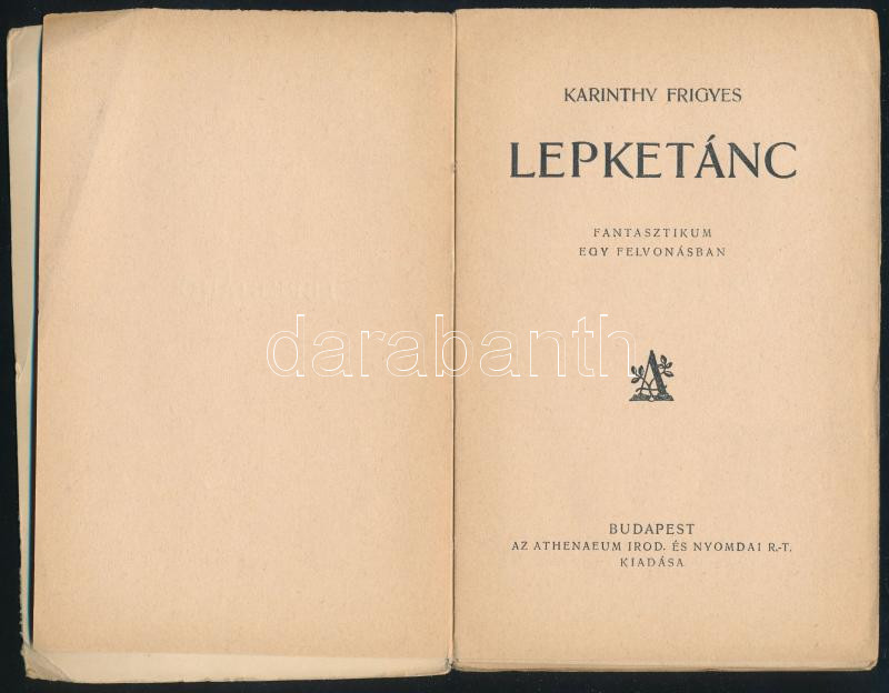 Karinthy Frigyes: Lepketánc. Fantasztikum egy felvonásban. Bp.,(1927),... https://www.darabanth.com/de/469-Fernauktion/469.0/Bucher/Bucher-Andere-kuriositaten~2000025/Karinthy-Frigyes-Lepketanc-Fantasztikum-egy-felvonasban-Bp-1927-Athenaeum-56-p-Kiadoi-pa~II3126441