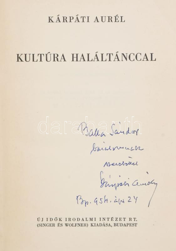 Kárpáti Aurél: Kultúra haláltánccal. Bp., Singer és Wolfner, 1954, kop... https://www.darabanth.com/de/469-Fernauktion/469.0/Bucher/Bucher-Andere-kuriositaten~2000025/Karpati-Aurel-Kultura-halaltanccal-Bp-Singer-es-Wolfner-1954-kopott-felvaszon-kotes~II3171201
