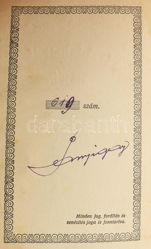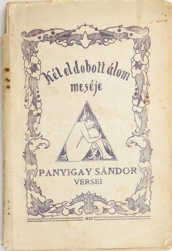 Panyigay Sándor: Két eldobott álom meséje. - - versei. (Számozott, aláírt!) Bp., 1925, Jakab-ny., 79+(1) p. Kiadói papírkötés, kissé foltos, sérült, a fűzéstől részben elváló borítóval. Számozott (619.), a szerző által aláírt példány.