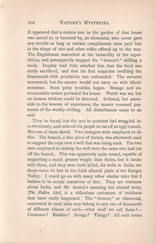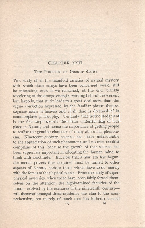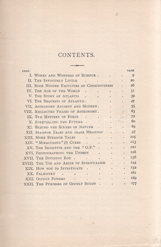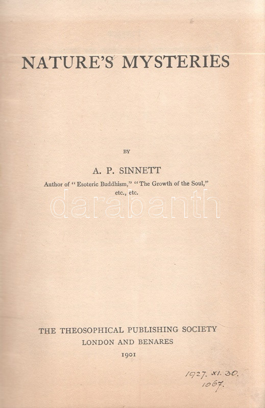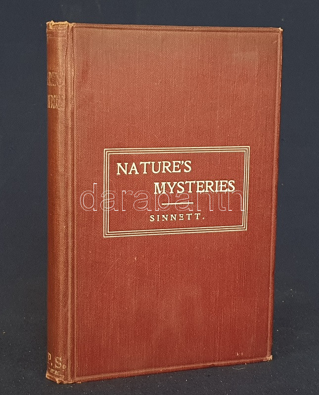 Sinnett, A[lfrred] P[ercy]: Nature's Mysteries. [Ezoterikus tárcák.] London-Benares, 1901. The Theosophical Publishing Society (Printed by Neill and Co. Ltd., Edinburg). 184 + [8] p. Alfred Percy Sinnett (1840-1921) brit író, okkultista, teozófus. A spiritualizmussal 1875-től került kapcsolatba, Helena Blavatsky művei két évvel később kezdte olvasni, Indiába költözése után személyesen is megismerkedett a teozófusok fő elméletírójával. Saját beszámolója szerint indiai tartózkodása alatt számos üzenetet kapott földöntúli mesterektől, melyek leiratát később közzé is tette. Publikáló szerzőként és szónokként gyorsan emelkedett a mozgalom ranglétráján, kiadásunk idején már a Teozófiai Társulat alelnöke volt. Kötetében a ,,Sun" amerikai magazinban megjelent ezoterikus cikkeiből válogat. Néhány cím (magyar fordításban): A tudomány csodáiból - A világ kora - Atlantisz története - Atlantisz hagyatéka - Ősi és modern asztronómia - Az erő misztériuma - Megjósolni a jövendőt - Különös esetek - Csodás gyógyulások - Fotografálni a láthatatlant - A varázsvessző - A spiritizmus hasznáról és káráról - Hogyan számoljunk be a szeánszokról - Tenyérjóslás - Az okkult tudományok célja. A címlevélen felül apró levágás, az első előzéken régi tulajdonosi bélyegzés. Poss.: Gyöngyöshalászy Takách Zoltán [Gyöngyöshalászy Takách Zoltán magyar származású zongoraművész, zongoratanár és zeneszerző. A budapesti Zeneakadémián tanult művész az 1900-as évek első évtizedében magas rangú magyar diplomaták ajánlásával került az amerikai komolyzenei élet sodrába - az amerikai keleti part nagyvárosaiban, New Yorkban, Philadelphiában és az amerikai elit üdülőhelyein lépett fel, egyúttal magán zeneiskolát is fenntartott az Egyesült Államokban.] Feliratozott, vaknyomásos kiadói egészvászon kötésben.
