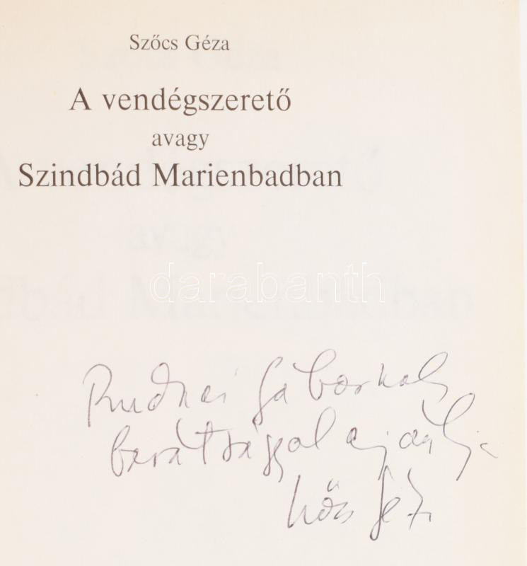 Szőcs Géza: A vendégszerető avagy Szindbád Marienbadban. DEDIKÁLT! Kol... https://www.darabanth.com/de/469-Fernauktion/469.0/Bucher/Bucher-Andere-kuriositaten~2000025/Szocs-Geza-A-vendegszereto-avagy-Szindbad-Marienbadban-DEDIKALT-Kolozsvar-1992-Gloria-~II3175036