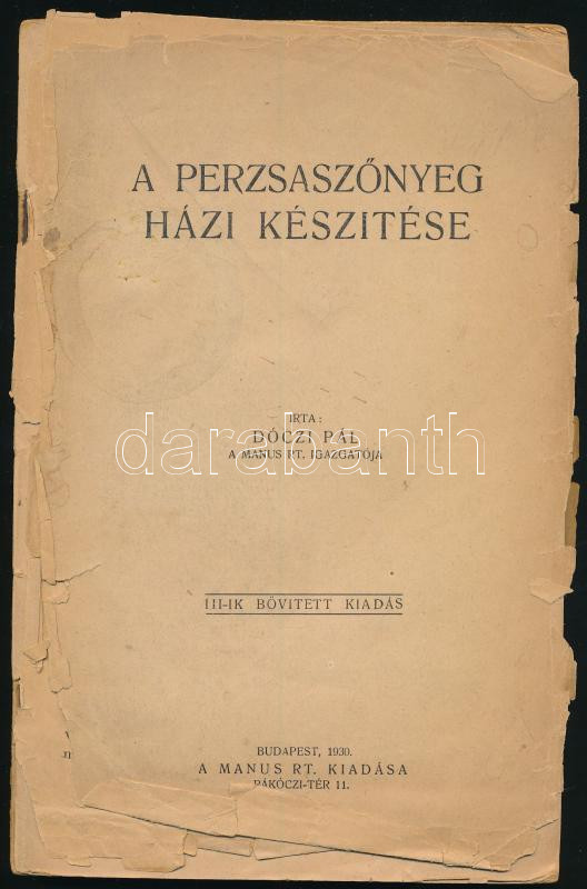Dóczi Pál: A perzsaszőnyeg házi készítése. Bp., 1930, A Manus Rt., 125+3 p. Harmadik bővített kiadás. Fekete-fehér illusztrációkkal. Kiadói papírkötés, széteső állapotban, részben szétvált kötéssel, az első két lap és az utolsó lap sérült, hiányos.