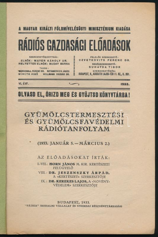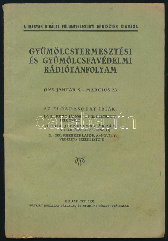 Horn János-Dr. Jeszenszky Árpád-Dr. Kerekes Lajos: Gyümölcstermesztési és gyümölcsfavédelmi rádiótanfolyam. (1933. január 5.-március 2.) Az előadásokat írták: I-VII. Horn János, VIII. Dr. Jeszenszky Árpád, IX.:Dr. Kerekes Lajos. Rádiós Gazdasági Előadások. VI. évf. A magyar királyi földmívelügyi miniszter kiadása. Bp., 1933, "Pátria",90+2 p. Kiadói papírkötés, jó állapotban.