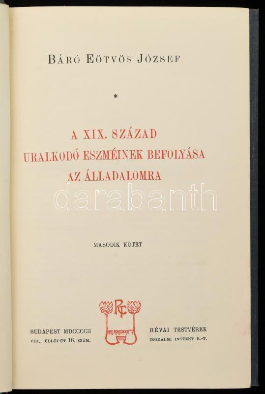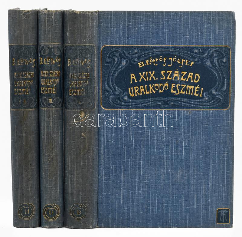Eötvös József: A XIX. század uralkodó eszméinek befolyása az álladalomra I-III. Összes Munkái XIII-XV. Bp.,1902, Révai. Kiadói szecessziós. festett, aranyozott Gottermeyer egészvászon-kötés, márványozott lapélekkel,