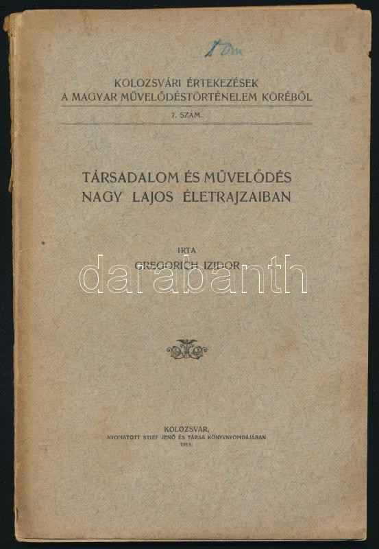 Gregorich Izidor: Társadalom és művelődés Nagy Lajos életrajzaiban. Kolozsvári értekezések a Magyar Művelődéstörténelem köréből 7.. Kolozsvár, 1915, Stief Jenő és Társa. Kiadói papírkötés, elvált borítóval, könyvtest több darabra elvált.