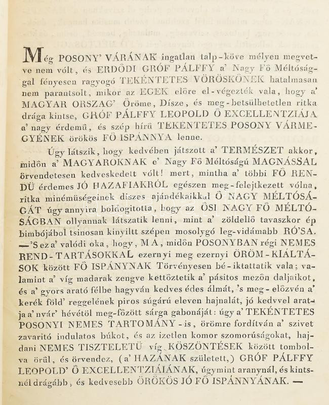Sermones occasione solennis Exc. ac Ill. Dni Leopoldi e comitibus Pálffy ab Erdőd, perpetui in Vöröskő etc. in haereditaria supremi capitaneatus arcis regiae Posoniensis et incl. comitatus ejusdem nominis perpetui ac supremi comitis officia die 19. mensis Augusti anno 1822. in lib. reg. civitate Posoniensi, generalique inclytorum comitatus ejusdem nominis statuum et ordinum conventu celebratae installationis dicti. (4-r. 64 l.) Posonii, 1822. Typ. Hareed. Belnayanorum. M. Kiadói papírkötésben. + Öröm. Midőn ő Excellentziája, a Nagy Méltgú Erdődi, és Vöröskői Gróf Pálffy Leopold ur, Posony vármegyének örökös fő ispannya, az 1822. eszt. Kis-asszony havának 19. napján fő ispanyi hivataljába, nemzeti nemes magyar ünnepléssel Posonyban törvényesen bé-iktattatna. (4-r. 2 lev.) Posonyban, ny. Simon Péter Wéber és fiának bet. Papírborítóval