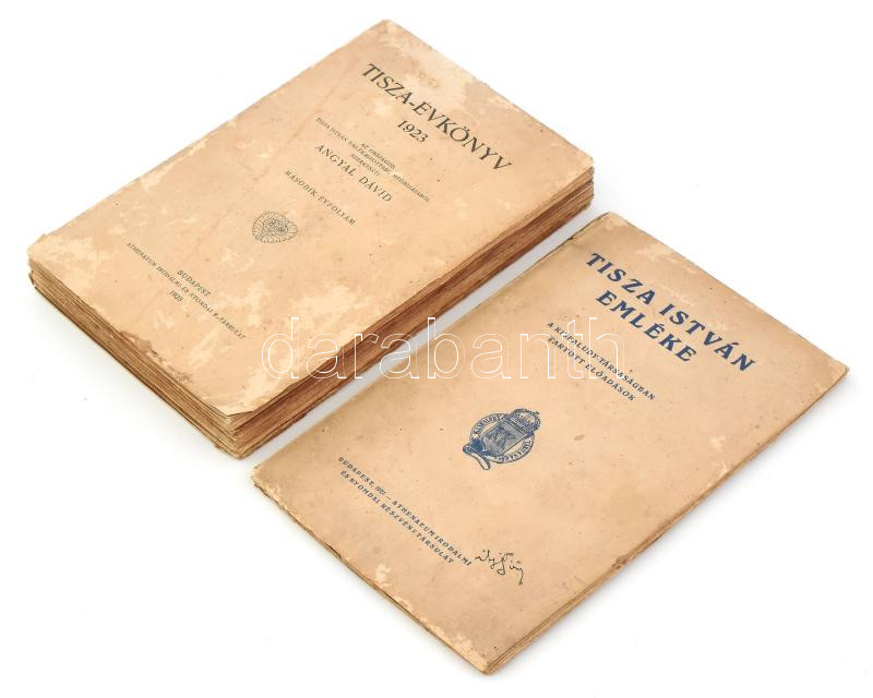Tisza István emléke. A Kisfaludy-Társaságban tartott előadások. Bp., 1921, Athenaeum, 1 t.+ 61+(3) p. Második kiadás. Kiadói papírkötés, viseltes borítóval, helyenként kissé foltos lapokkal. + Tisza-évkönyv 1923. Az Országos Tisza István Emlékbizottság megbízásából szerk.: Angyal Dávid. Második évfolyam. Bp., 1923, Athenaeum, 277+(3) p. Kiadói papírkötés, viseltes, sérült borítóval, helyenként kissé foltos lapokkal, nagyrészt felvágatlan.