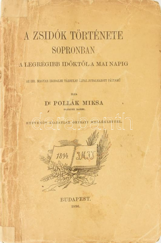 Dr. Pollák Miksa: A zsidók története Sopronban a legrégibb időktől a mai napig. Az Izr. Magyar Irodalmi Társulat Kiadványai VI. Bp., 1896, (Franklin-Társulat), Kiadói papírkötés, sérült és javított gerinccel, kopott borítóval, hiányos (353-379 p. hiányzik), részben felvágatlan példány.