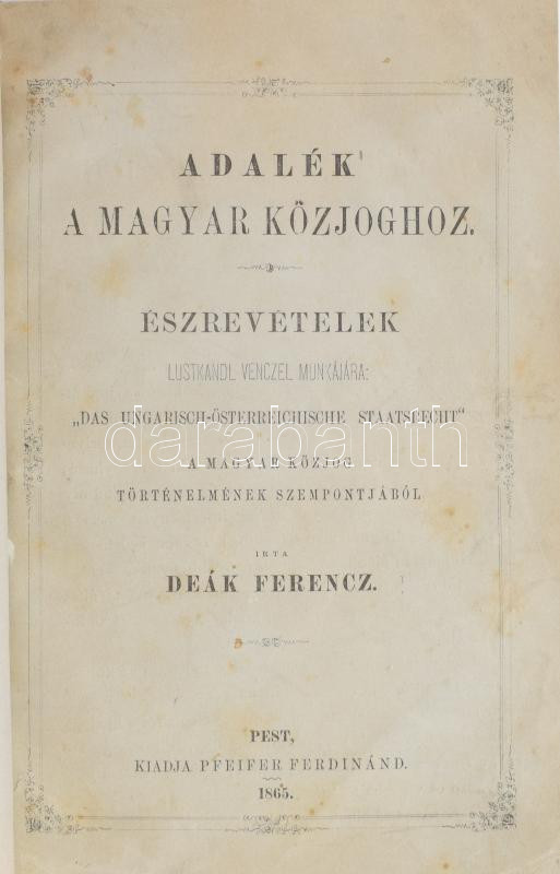 Deák Ferenc: Adalék a magyar közjoghoz. Észrevételek Lustkandl Venczel munkájára: "Das Ungarisch-Österreichische Staatsrecht! A magyar közjog történelmének szempontjából. A "Budapesti Szemle" 1865. I. füzetéből. Pest, 1865, Pfeifer Ferdinánd, 188 p. Kiadói papírkötés, modern műbőr védőkötésben