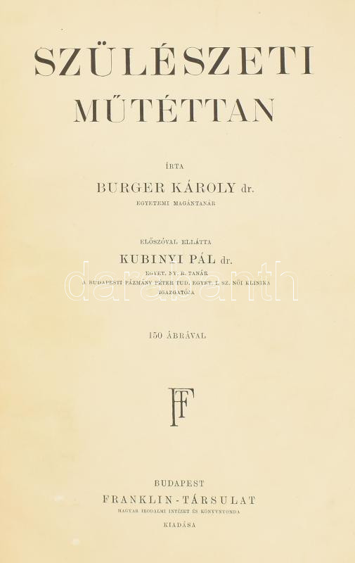 Burger Károly: Szülészeti műtéttan. Bp., én., Franklin. Kiadói aranyozott egészvászon-kötés, kopott borítóval, a gerincen apró sérülésekkel. + Kovács Ferenc: Gyakorlati és műtétes szülészet. Bp., 1936, Magyar Orvosi Könyvkiadó Társulat. Kiadói aranyozott egészvászon-kötés, kissé kopott borítóval, laza fűzéssel.
