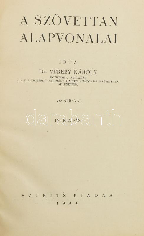 Vereby Károly: A szövettan alapvonalai. [Bp.], 1944, Szukits, XI+436 p.+1 t. Átkötött félvászon-kötés, kissé kopott borítóval, két hiányzó táblával, a 385-400. oldalak között gépelt oldalakkal pótolt, benne ceruzás aláhúzásokkal és bejegyzésekkel.