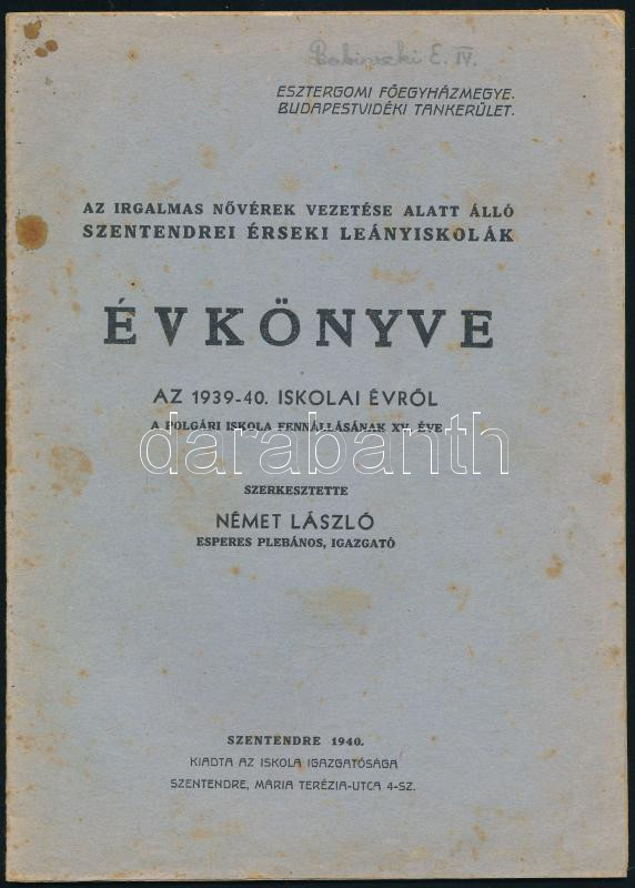 Az Irgalmas Nővérek vezetése alatt álló Szentendrei Érseki Leányiskolák értesítője az 1936-1937. iskolai évről. A polgári iskola fennállásának 12. évében. Közzéteszi Német László. Szentendre, 1937,Szentendrei Lányiskolák Igazgatósága, 28 p. Kiadói papírkötés, foltos borítóval, kissé foltos lapokkal.